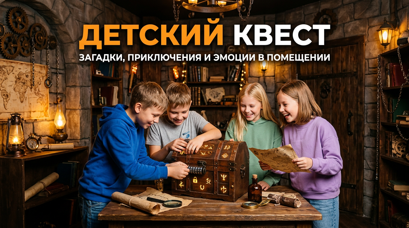 - Для детей (7-11 лет): Идеальны сказочные и мультяшные сценарии. Загадки должны быть в основном на поиск предметов и простые действия (нажать кнопки в правильном порядке, сопоставить цвета). Часто такие квесты проводятся с аниматором, который направляет детей и помогает им.